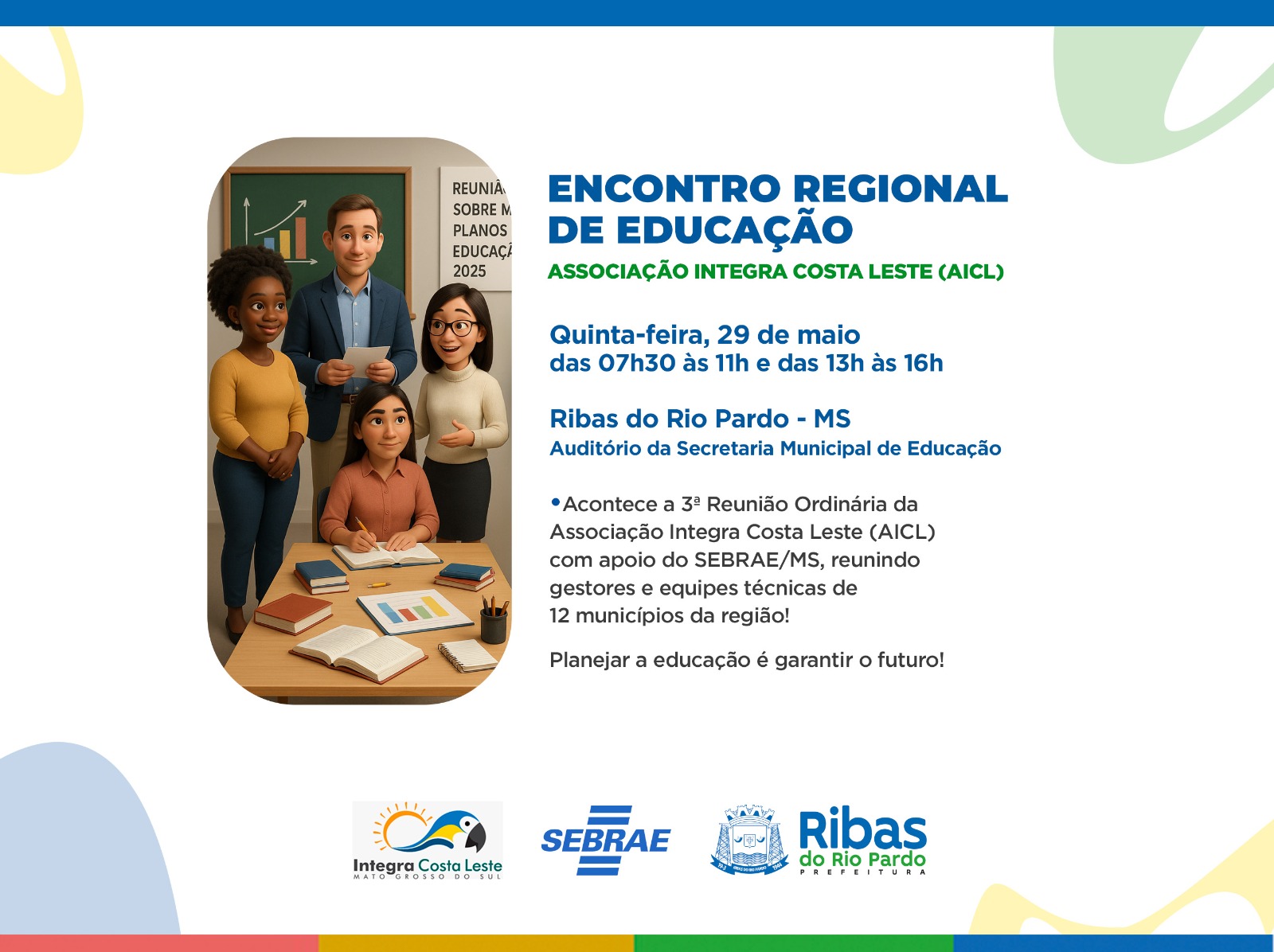 Nesta quinta-feira, 29 de maio, Ribas do Rio Pardo será palco da 3ª Reunião Ordinária de Educação da Associação Integra Costa Leste (AICL) em parceria com o Sebrae/MS. O evento será realizado no auditório da Secretaria Municipal de Educação, das 8h às 16h, reunindo gestores e técnicos da área educacional de 12 municípios da região Costa-Leste de Mato Grosso do Sul.