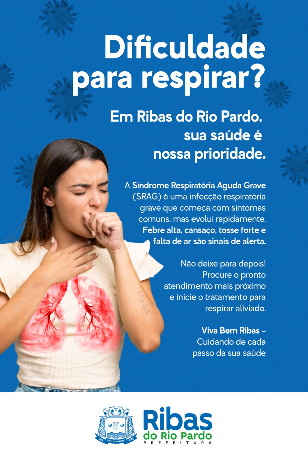 Com foco na prevenção e no cuidado com a população, a Prefeitura de Ribas do Rio Pardo, por meio da Secretaria Municipal de Saúde, está intensificando a divulgação de informações sobre a Síndrome Respiratória Aguda Grave (SRAG). A campanha publicitária tem como objetivo conscientizar os moradores sobre os sintomas da doença e a importância de procurar atendimento médico ao menor sinal de agravamento.