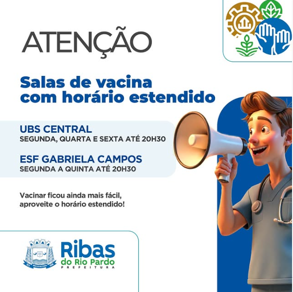 A Prefeitura Municipal de Ribas do Rio Pardo informa que, a partir de agora, os postos de saúde do município estão com o horário de vacinação estendido, funcionando até 20h30. Essa medida visa facilitar o acesso da população à vacinação e garantir que todos estejam com o esquema vacinal em dia.