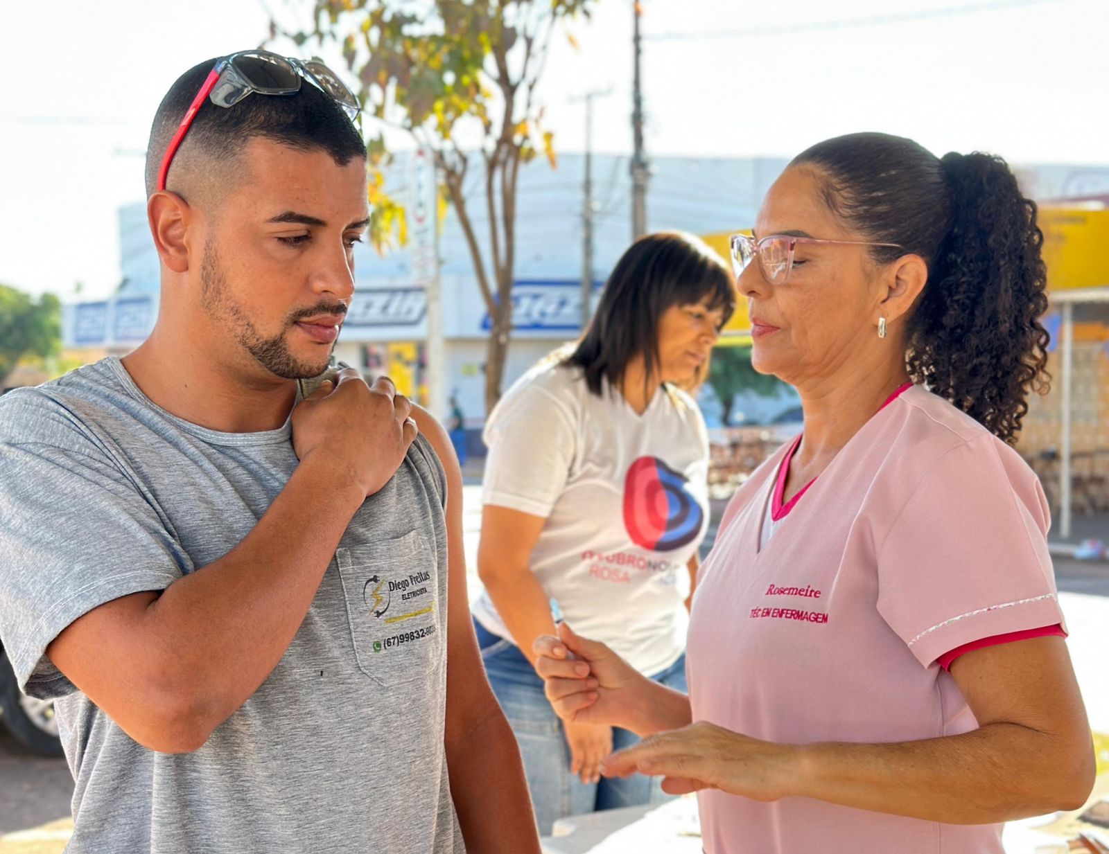 Realizado em frente ao Sicredi, o mutirão contou com serviços gratuitos como verificação da pressão arterial, vacinação contra a Influenza e um ponto de coleta para o descarte correto de medicamentos vencidos.